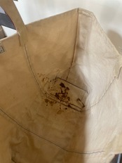全体的に茶ばみや内側に汚れがありますが、生地自体はまだハリがある状態です。